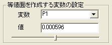 可視化したい等値面を構築するための変数とその値をここでは設定します。変数の指定はプルダウンメニューでおこなうことができます。値の設定は、値のエディットボックスか、直下のスライダーバーで指定することができます。