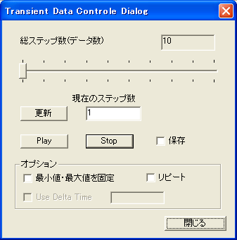 このボタンをクリックすると右図のようなダイアログボックスが起動します。 このダイアログボックスでは、非定常用の可視化機能を使用することができます。各ボタンの説明は、以下を参照ください。