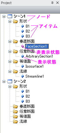 シーン新規にシーン(Scene)が作成された場合このノードが追加されます。 シーンは、形状ノード、垂直断面ノード、任意断面ノード、流線ノード、等値面ノードを必ず持ちます。作成されたシーンのプロパティの編集は、プロパティウインドウでおこなうことができます。 形状計算結果データをロードした時に、 このノードに全てのオブジェクト(アイテム)が追加されます。作成されたアイテムの編集は、プロパティウインドウでおこなうことができます。 垂直断面メインメニューの垂直断面 をクリックした場合、このノードに作成した垂直断面(アイテム)が追加されます。作成されたアイテムの編集は、プロパティウインドウでおこなうことができます。 任意断面メインメニューの任意断面 をクリックした場合、このノードに作成した任意断面(アイテム)が追加されます。作成されたアイテムの編集は、プロパティウインドウでおこなうことができます。 流線メインメニューの流線 をクリックした場合、このノードに流線(アイテム)が追加されます。作成されたアイテムの編集は、プロパティウインドウでおこなうことができます。 等値面メインメニューの等値面 をクリックした場合、このノードに等値面(アイテム)が追加されます。作成されたアイテムの編集は、プロパティウインドウでおこなうことができます。 |