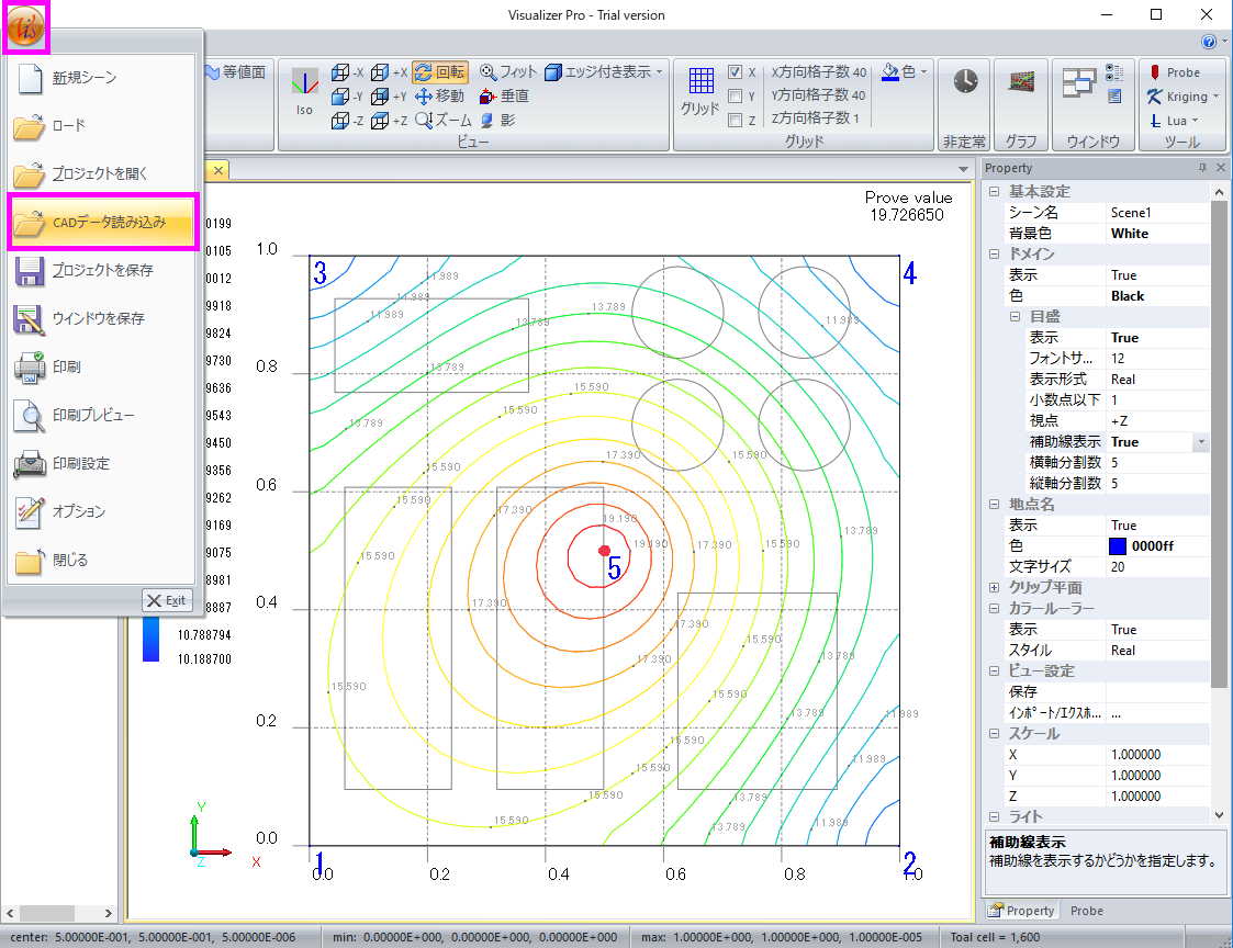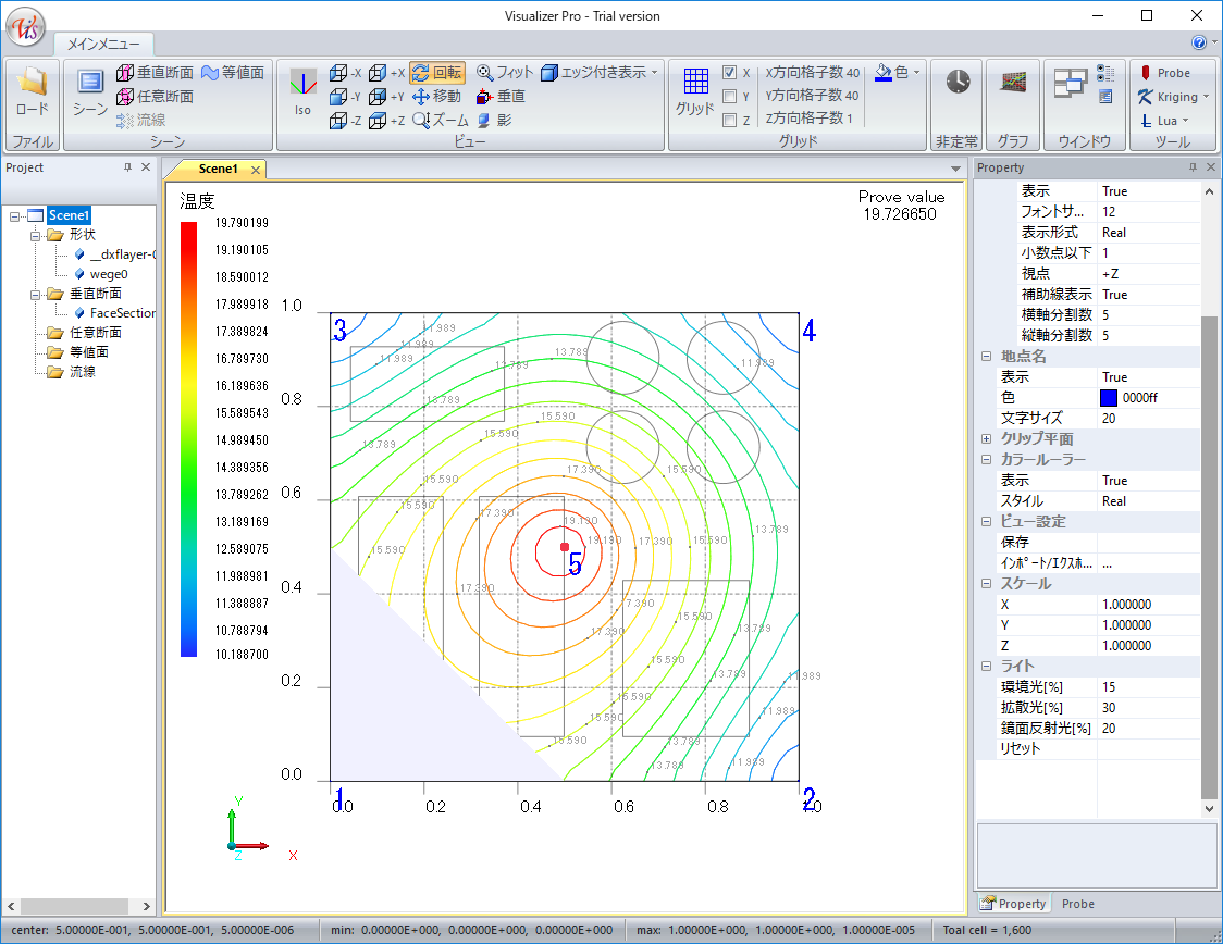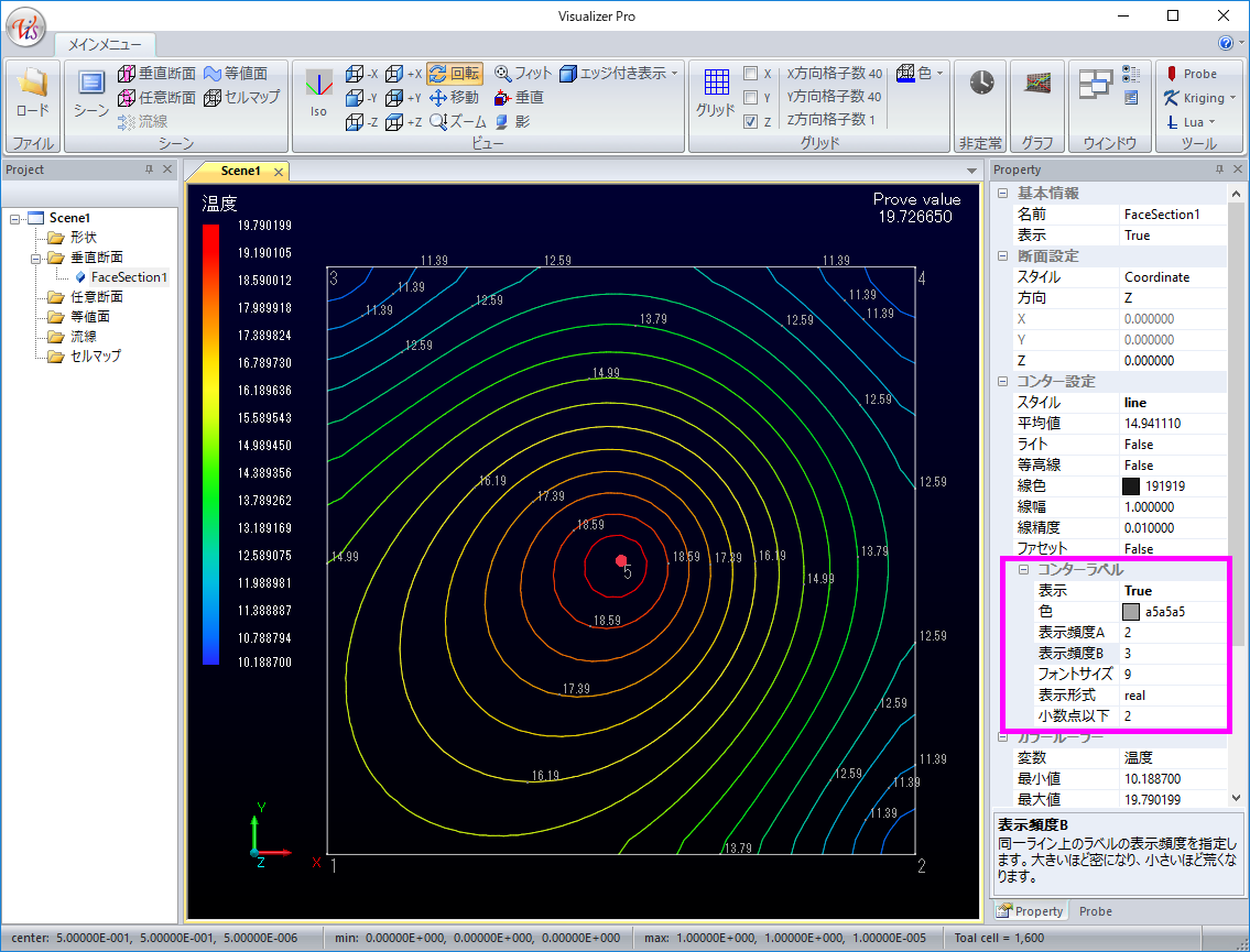 コンターラベルを表示したい場合は、右のプロパティウインドウの「コンターラベル」表示をTrueにします(下図参照)。