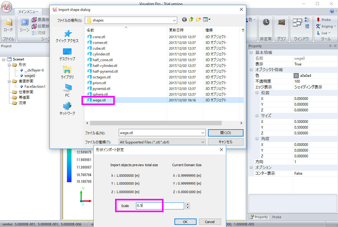 形状インポート設定ダイアログで、Scaleは、0.5としてOKをクリックします(下図参照)。