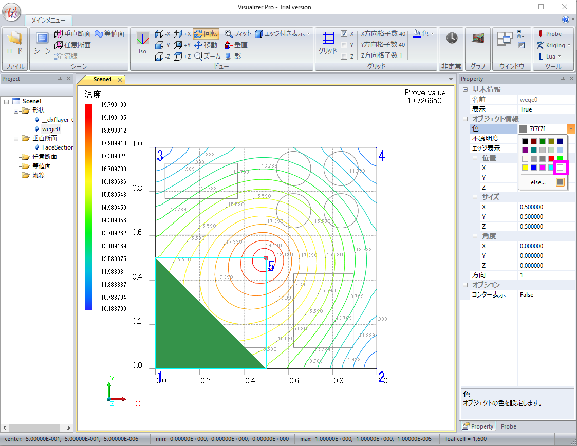 形状を非表示にし(ツリーの中のwege0を選び、右クリックしてポップアップメニューを表示し、非表示を選択)、コンターのプロパティを下図のように設定します。