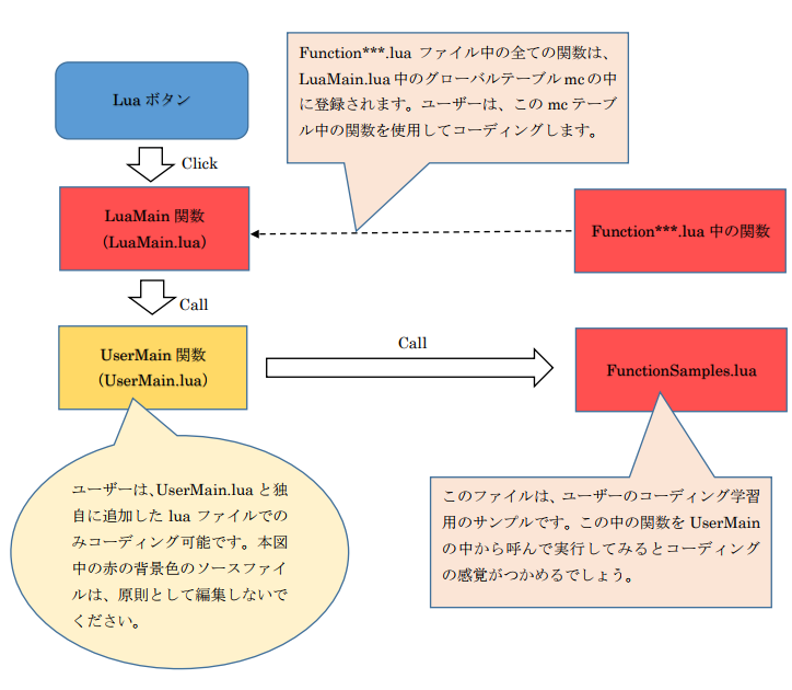 2. 基本ルールと仕組み「Lua」ボタンの中の「Edit」ボタンをクリックした時に表示される場所に、luaのソースファイルが全て保存されています。![]() これらのソースファイルは、次のようなような依存関係があり、Luaボタンをクリックすると図中に示した順番でプログラムは実行されます。 ![]() 3. 使用方法独自の関数を作る場合、次の2つの方法があります。本質的にはどちらも同じですが、 たくさんの機能を作りたい場合は、整理できるという観点からAの方がお勧めです。