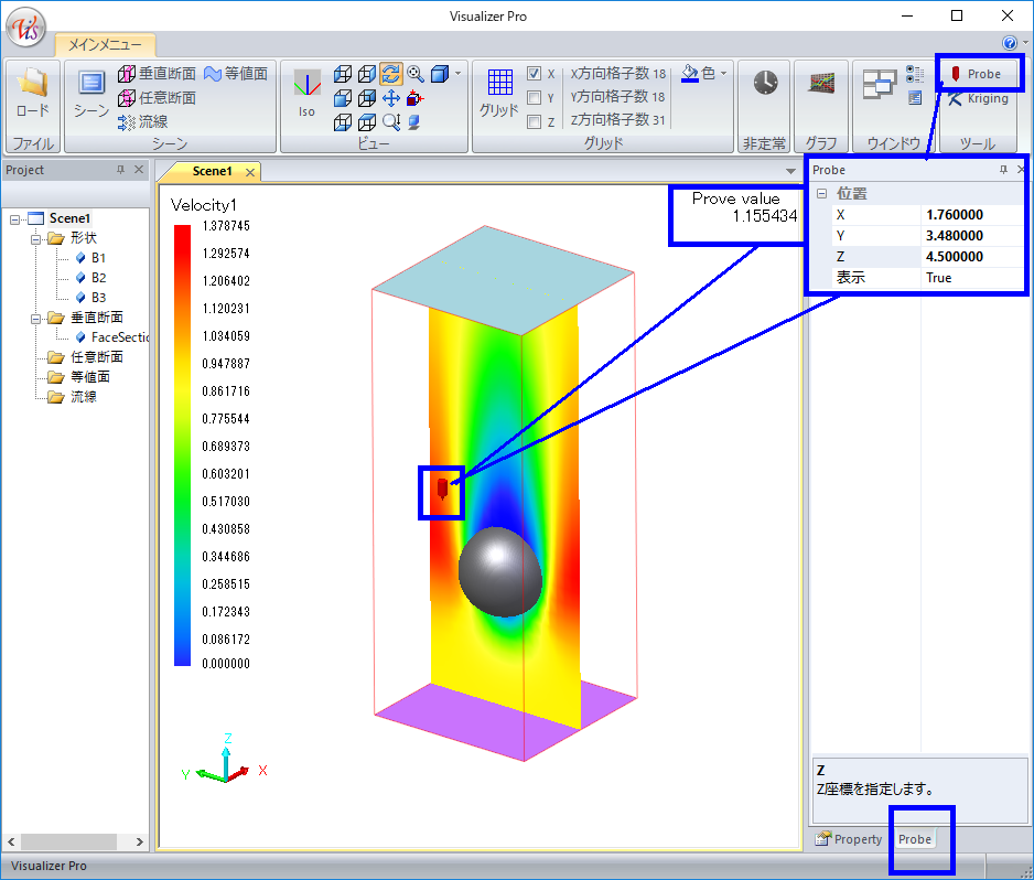 このプローブを使用して、計算領域内の任意の位置での計算結果の数値(下図中のProbe value)を確認することができます。